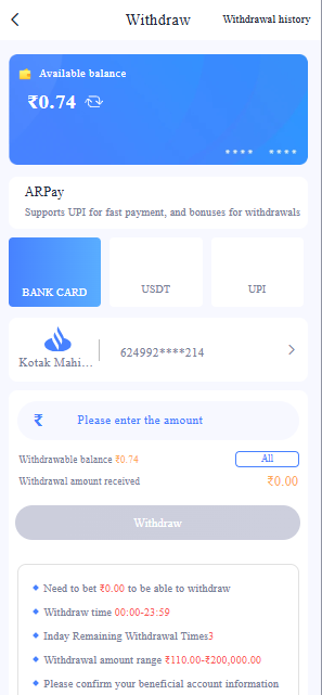 Go to “Withdrawal,” select method (UPI/IMPS), enter amount, and confirm with OTP. Minimum ₹90.